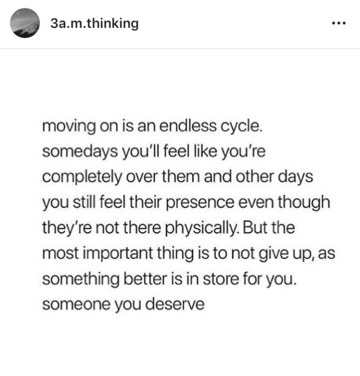 So I realize as hard as it is and as much as I don’t want to. I need to fully move on. Stop comparing the excitement and comfort I felt in the last few months of our relationship to a new relationship. Stop worrying about how he is doing and who he is dating.