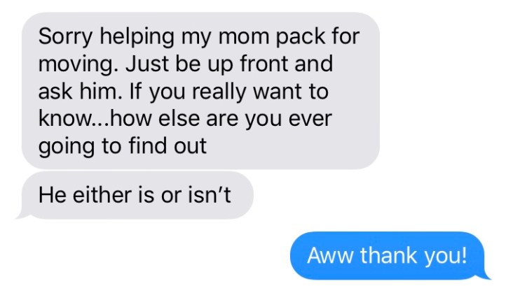 This text was going to change things. It was going to really take the elephant out of the living room. My perception and feelings about our friendship were going to shift. It needed to be asked so I can move on.